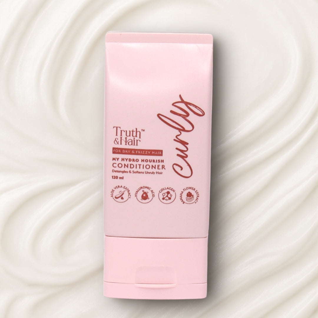 Meet our Hydro nourish conditioner for curly hair- a lightweight, yet nourishing formula whipped to tenderly smoothen the hair cuticles, reduce frizz & breathe life into every strand. Picture your curls, like springs in a dance of joy, touched by the rejuvenating powers of nature's brilliance. Infused with the secret whispers of Banana Flower extract this celestial blend weaves lustre into each strand and fortify your hair's very essence.