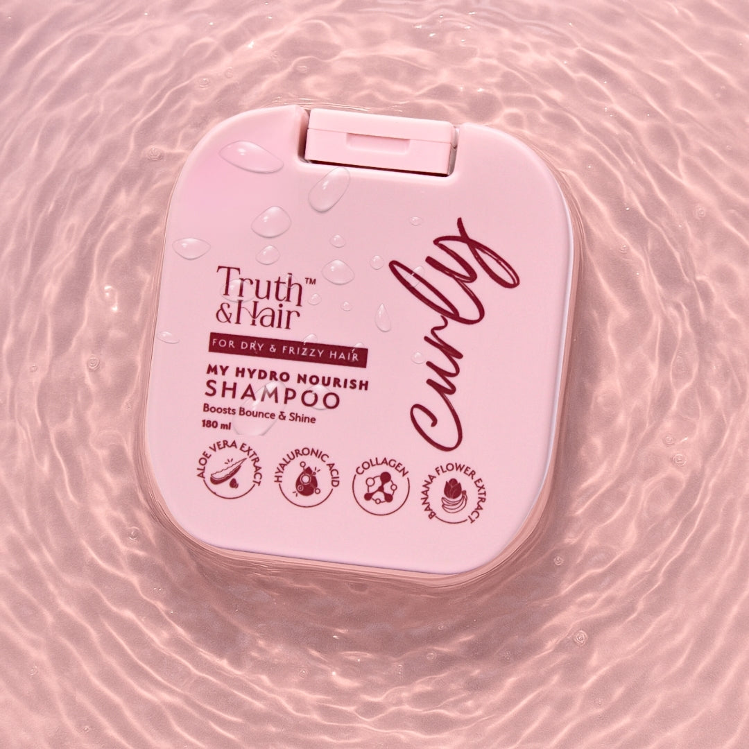 Get ready to immerse in the Truth & Hair experience for curly hair: Begin by letting the soft gush of Luke warm water (not hot) soak your hair- feeling the gentle cascade. Now pour a small amount of hydro nourish shampoo into your palms, letting it flow with the rhythm of gravity. Feel the luxurious emulsion as it transforms into a creamy lather. Imagine a gentle rainfall in a tropical paradise, where each droplet carries the secrets of hydrating botanicals and nourishing extracts. Massage it into your scalp and hair, letting it caress your scalp and embrace every strand. Feel the rich lather envelop each strand, cleansing away impurities while caressing your curls with its nourishing touch. Rinse away the day, feeling renewed and nourished with each thorough rinse.