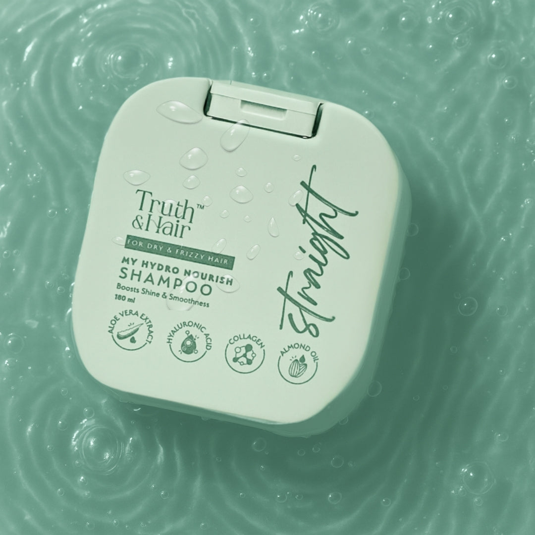 Get ready to immerse in the Truth & Hair experience for straight hair: Begin by letting the soft gush of Luke warm water (not hot) soak your hair- feeling the gentle cascade. Now pour a small amount of hydro nourish shampoo into your palms, letting it flow with the rhythm of gravity. Feel the luxurious emulsion as it transforms into a creamy lather. Now breathe in the refreshing aroma that dances in the air, a harmonious blend of nature's bounty ready to awaken your senses. Massage it into your scalp and hair, letting it caress your scalp and embrace every strand. Feel the rich lather envelop each strand, cleansing away impurities while caressing your hair with its nourishing touch. Rinse away the day, feeling renewed and nourished with each thorough rinse.