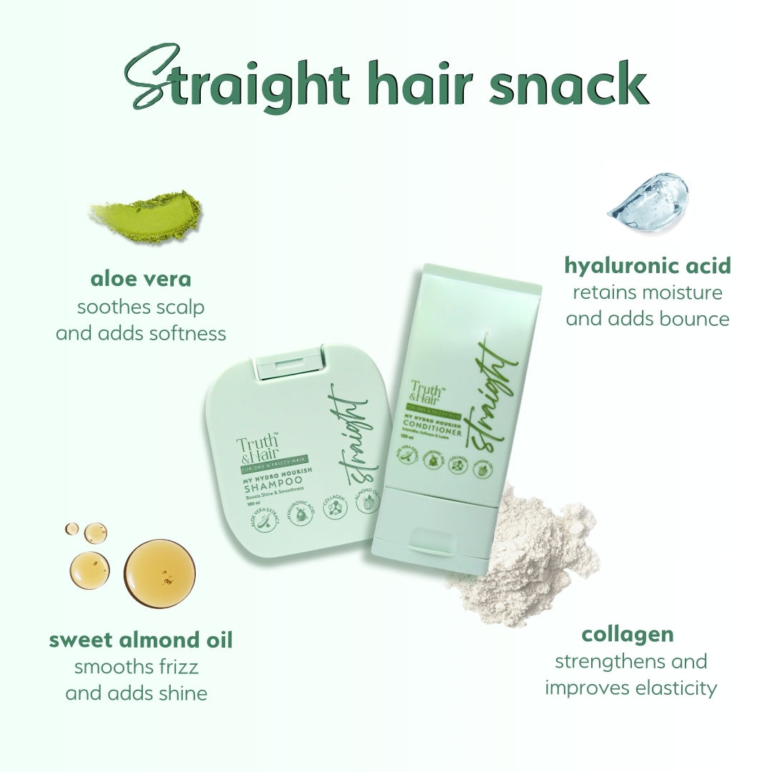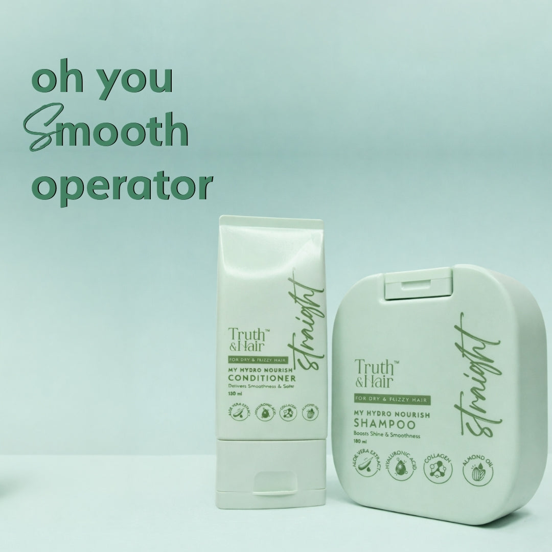 Shampoo - Meet our Hydro nourish shampoo for straight hair—clinically tested, a gentle, sulfate & paraben-free elixir designed to love your scalp and pamper your locks. Imagine your hair sipping on a blend infused with the magic of Almond oil, known for boosting shine and softening the hair. A dreamy fusion of Hyaluronic Acid and Collagen working their magic- Hyaluronic Acid dives deep, locking in moisture from root to tip, ensuring your strands are drenched in hydration. Collagen steps in as the strength booster, fortifying your scalp & each strand for that extra bounce and resilience. Now, our secret? A powerhouse mix featuring Aloevera Extract, Dandelion Root Extract, and other nurturing ingredients, rejuvenating your hair from top to bottom. Get ready for hair that feels loved, from root to tip!
