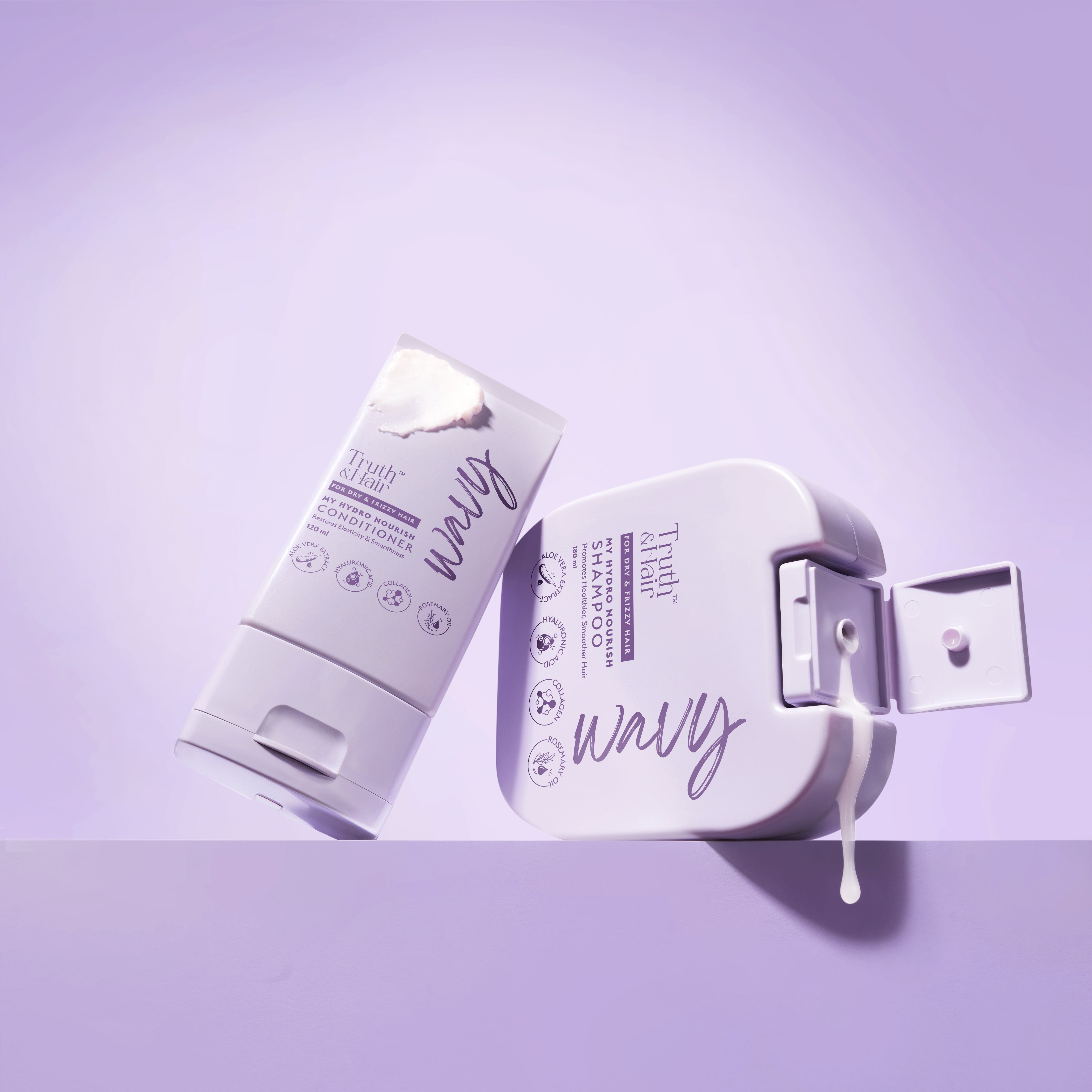 Shampoo- Get ready to immerse in the Truth & Hair experience for wavy hair: Begin by letting the soft gush of Luke warm water (not hot) soak your hair- feeling the gentle cascade. Now pour a small amount of hydro nourish shampoo into your palms, letting it flow with the rhythm of gravity. Feel the luxurious emulsion as it transforms into a creamy lather. Close your eyes and let the refreshing aroma of rosemary enchant your senses. Massage it into your scalp and hair, letting it caress your scalp and embrace every strand. Feel the rich lather envelop each strand, cleansing away impurities while caressing your waves with its nourishing touch. Rinse away the day, feeling renewed and nourished with each thorough rinse.